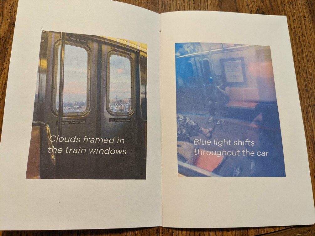 A dreamy photo zine with pictures taken on the nyc subway and short, introspective poetry :) Surprisingly made with no edits; the lighting in the train cars is just really weird.